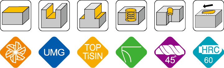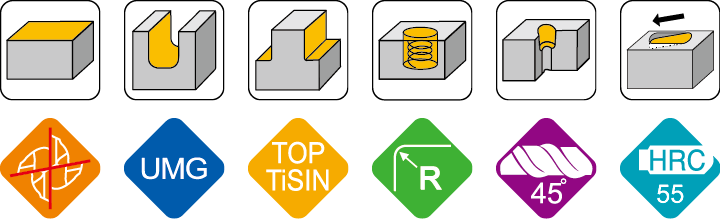- 应用材质:碳素钢, 十字钢, 合金钢, 调质钢(≦55°HRC), 不锈钢, 铸铁。