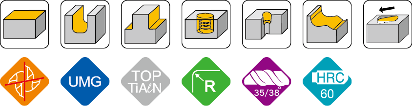 - 应用材质:碳素钢, 十字钢, 合金钢, 调质钢(≦55°HRC), 铸铁。