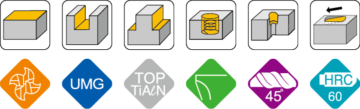 - 应用材质:碳素钢, 十字钢, 合金钢, 调质钢(≦55°HRC), 铸铁。