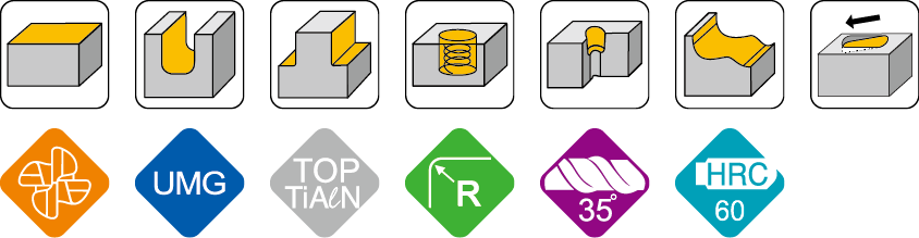 - 刀型设计I:刀尖采用R角设计, 有效分散切削应力, 降低刀尖崩裂, 提升加工面粗度, 并延长刀具寿命。