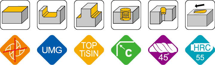 - 应用材质:碳素钢, 十字钢, 合金钢, 调质钢(≦55°HRC), 不锈钢, 铸铁。